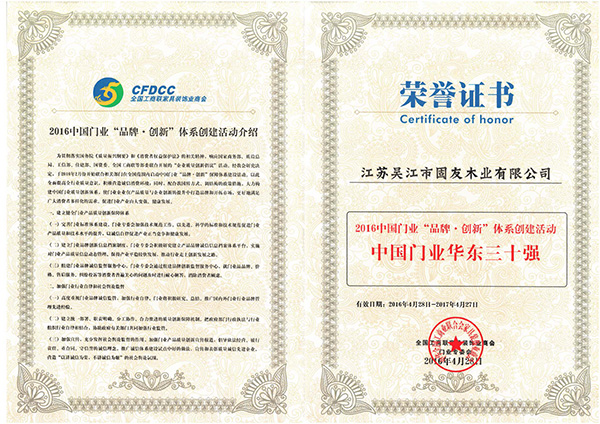 中國材與木制品流通協(xié)會(huì)木門窗專業(yè)委員會(huì)15周年榮譽(yù)證書